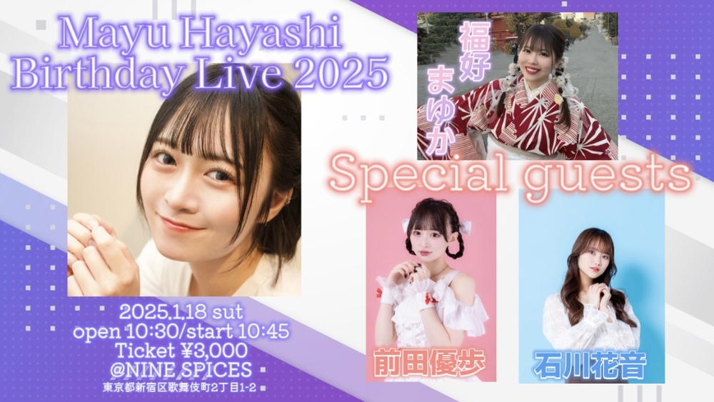 林真由生誕祭2025 SCHEDULE 2025/01/18(土) 10:45 - 林真由生誕祭2025 【日時】2025年1月18日 open10:30/start10:45 【会場】新宿NINE SPICES 【料金】¥3,000+D代 ご予約 URLをコピーする 報告する